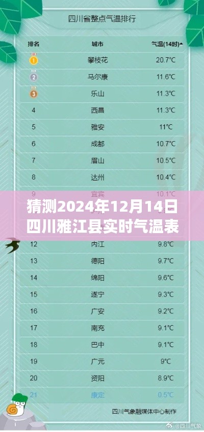 讓我們來猜猜看,2024年12月14日,四川雅江縣的氣溫會是怎樣的呢?是溫暖的陽光照耀著大地,還是帶著一絲寒冷的冬風(fēng)?無論結(jié)果如何,這場探索之旅都將充滿驚喜和樂趣。
